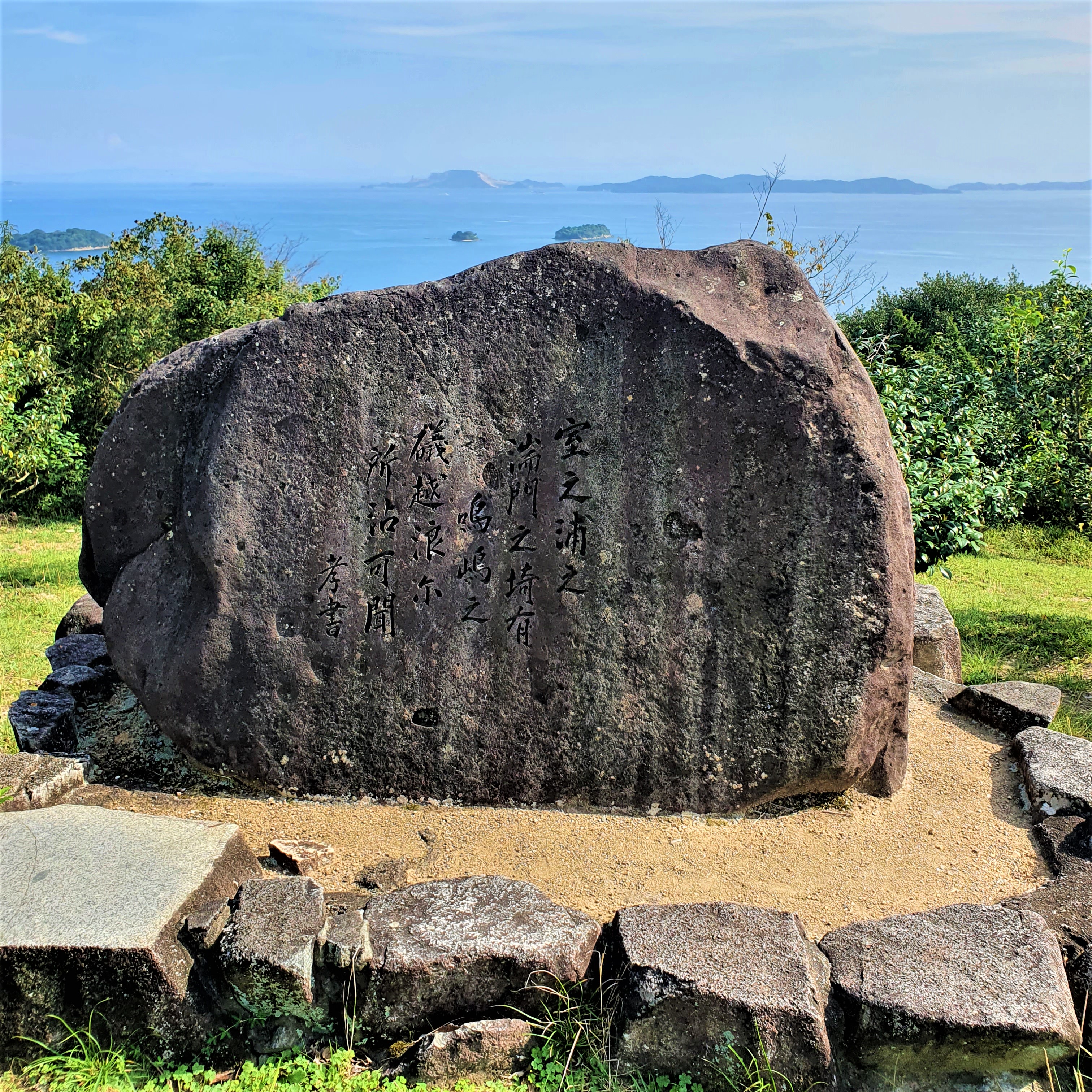 Cape Manyo off the Aioi bay, is of a milder nature. As one goes west from Osaka Bay, past Kobe and Himeji, the texture and tone of the sea seem to become softer. The Seto Inland Sea, a waterbody connecting the Pacific Ocean and the Sea of Japan, separates three of Japan’s largest islands: Honshu, Shikoku, and Kyushu. Cradled by the surrounding coastal areas, speckled with a number of small islands, the sea leads to a moderate annual climate in the region. The green hilly islands, the fishing boats and the mild blue sea make for a rewarding view. The view at Cape Manyo was immortalized in a poem by Akahito Yamabe, an eight century AD poet from the Nara period who published his poems in Manyosho, a famous collection of short poems by people from various parts of the society at the time.