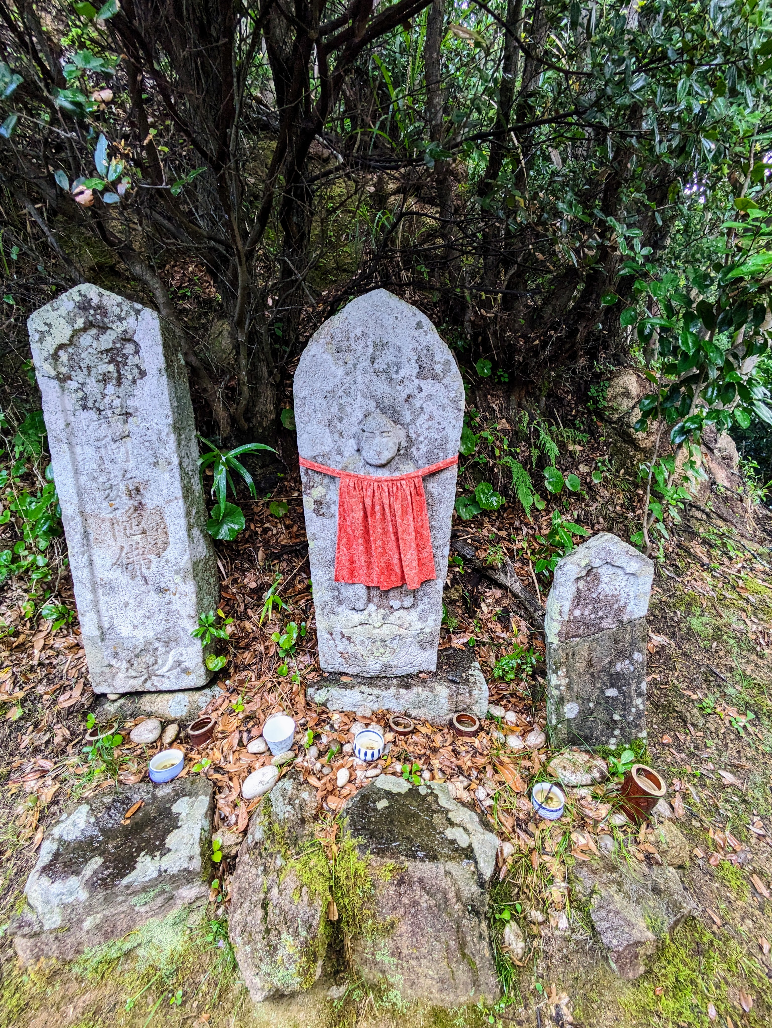 On a humid summer day, the courting calls of cicadas start to overpower the sound of cars. Just a few meters off the main road, stone statues with red caps guard a moss-covered stone path trail leading to a thick forest. These Jizo statues are guardians to koyazaka, a small fragment of the Kumano Kodo trail.